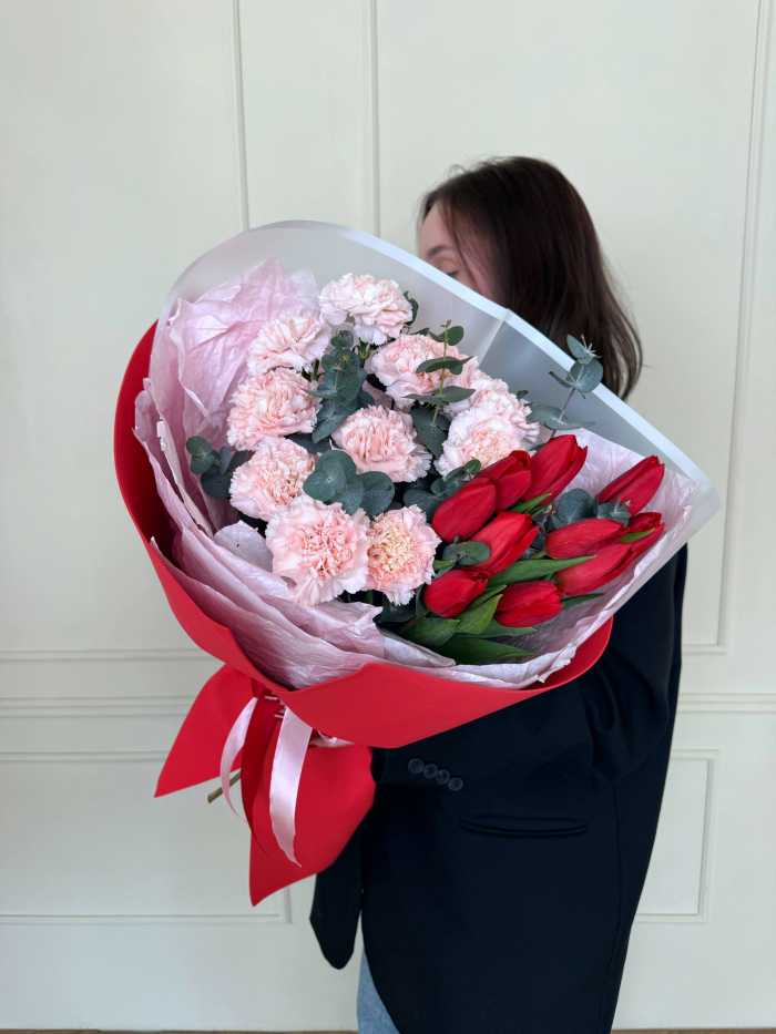 Тюльпаны - 9 шт, Диантусы - 10 шт, Эвкалипт - 1 шт